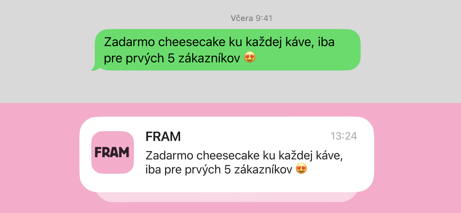 - Novinka v ponuke (exkluzivita): „Prvýkrát u nás! Ochutnajte našu novú limitovanú kávu z Kolumbie ☕. Len pre členov vernostného klubu dnes s domácim koláčom.“